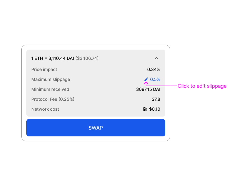 If you do include slippage tolerance in the details panel, you should also make it editable directly from here. This is a good example of an “accelerator”; a neat UX trick that can speed up experienced users’ flows, without impacting the general usability of the app.